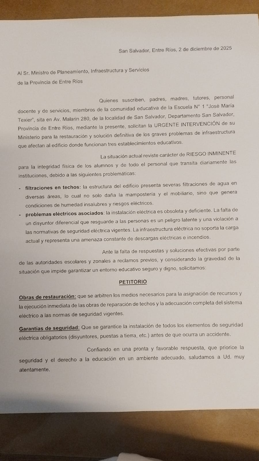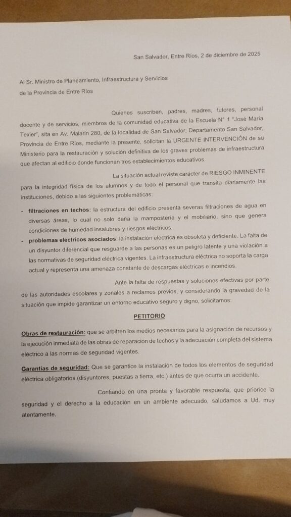 La comunidad educativa de la Escuela N° 1 “José María Texier” ha elevado un pedido de auxilio al Gobierno de Entre Ríos, advirtiendo sobre una situación de “riesgo inminente” que amenaza la seguridad de alumnos y personal. Padres, madres, tutores, personal docente y de servicio de la institución de Av. Malarín 220 enviaron una nota formal, fechada el 2 de diciembre de 2025, al Ministro de Planeamiento, Infraestructura y Servicios de la provincia, solicitando su intervención urgente para evitar una tragedia.