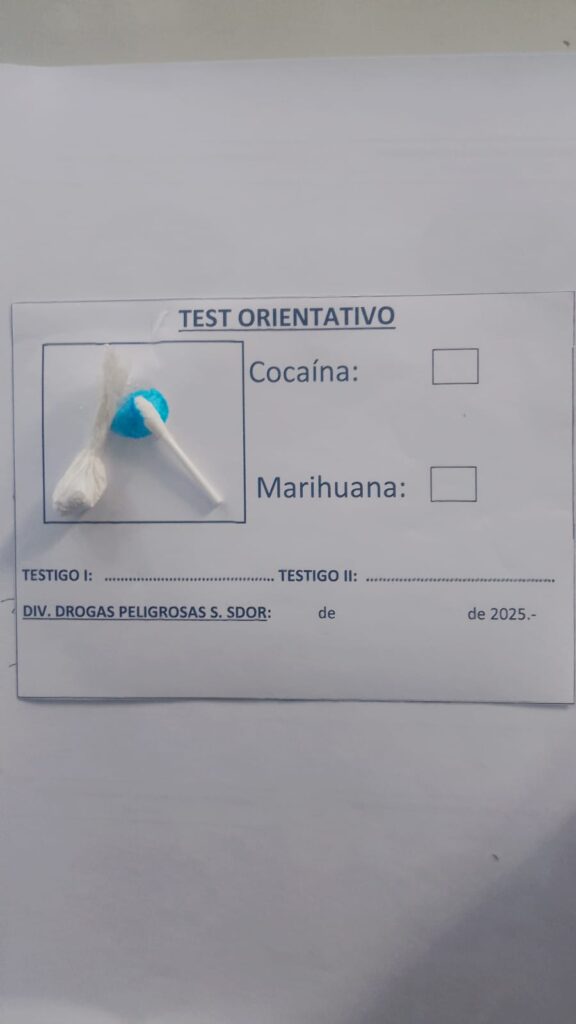 Ante la sospecha de que se tratara de estupefacientes, se solicitó la presencia de la División Toxicología (Drogas Peligrosas). Los especialistas realizaron el correspondiente análisis de campo, el cual arrojó un resultado positivo para cocaína. La sustancia, que pesaba casi un gramo, fue secuestrada y puesta a disposición de la justicia.