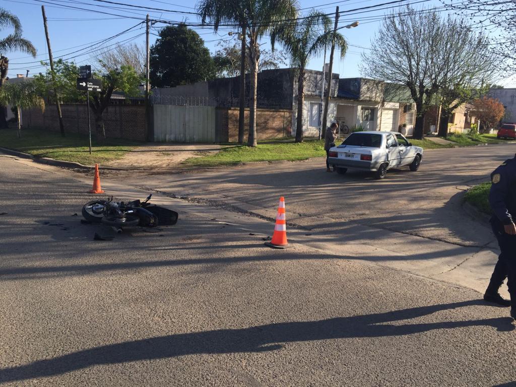 San Salvador. En la fecha siendo las 08.10 hs, por causas que se tratan de establecer se produce un siniestro vial en Avenida De Los Rusos y Calle Manuel Belgrano, entre un automóvil Renault 9, conducido por una vecina de esta ciudad, de 36 años y un motovehículo marca guerrero DL magic 110cc, conducido por un joven de 22 años, quien no poseía documentación del rodado, por lo que es retenido bajo acta.