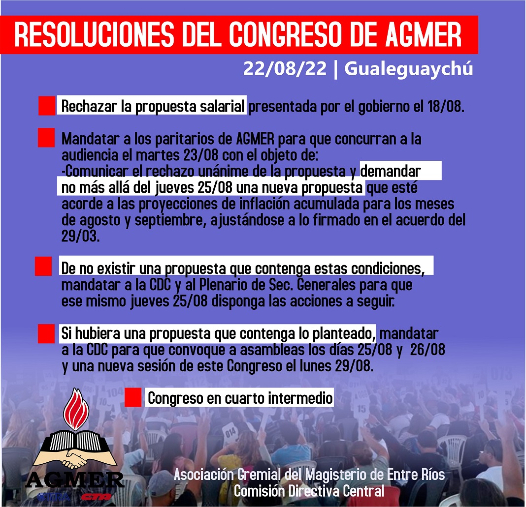 Gualeguaychú. El Congreso Extraordinario de Agmer definió rechazar la propuesta salarial presentada por el gobierno el jueves pasado. Exigen que la nueva propuesta del Ejecutivo esté acorde a las proyecciones de inflación acumulada para los meses de agosto y septiembre.
