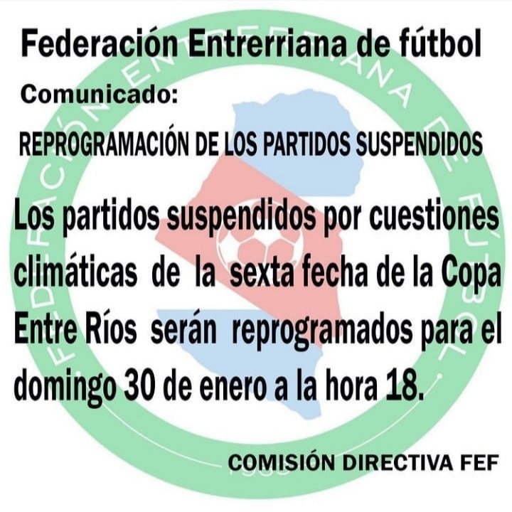 Gualeguay. La Federación Entrerriana de Futbol informó a Centro Noticias que analizando y teniendo en cuenta que gran parte de los partidos programados de la sexta fecha del “Torneo Carlos Romero Copa Bonnin Hnos” debieron ser suspendidos por cuestiones climáticas - más del 50% - la Comisión Directiva de la FEF toma la decisión de reprogramar los encuentros para el próximo domingo 30 de enero a la hora 18.