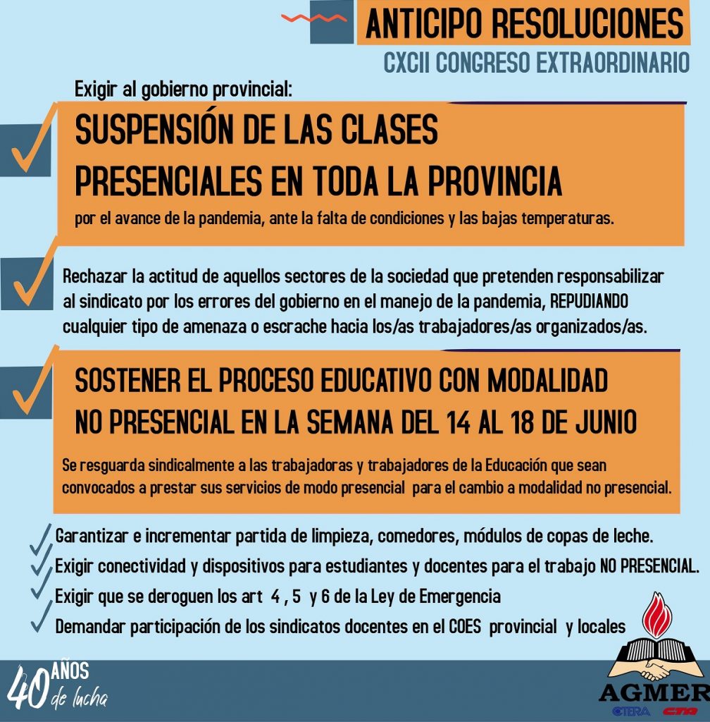 Paraná. El CXCII Congreso Extraordinario de AGMER sesionó este viernes 11 de junio, con modalidad virtual. Publicamos un anticipo de las Resoluciones.