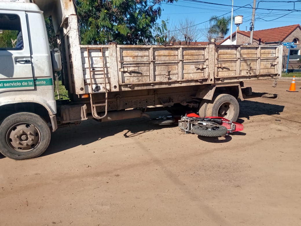 San Salvador. Aproximadamente 14:10 Hs. de este jueves 27 de mayo, por causas que se tratan de establecer, se produce una colisión en la intersección de las arterias Illia y Crispín Velázquez de esta ciudad, entre un camión y una moto.