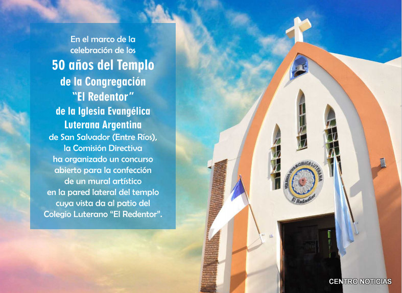 San Salvador. En el marco de los 50 años del Templo de la Congregación "El Redentor" de la Iglesia Evangélica Luterana Argentina de nuestra ciudad, la comisión Directiva ha organizado un Concurso abierto para la confección de un mural artístico en la pared lateral del templo cuya vista da al patio del Colegio Luterano "El Redentor".