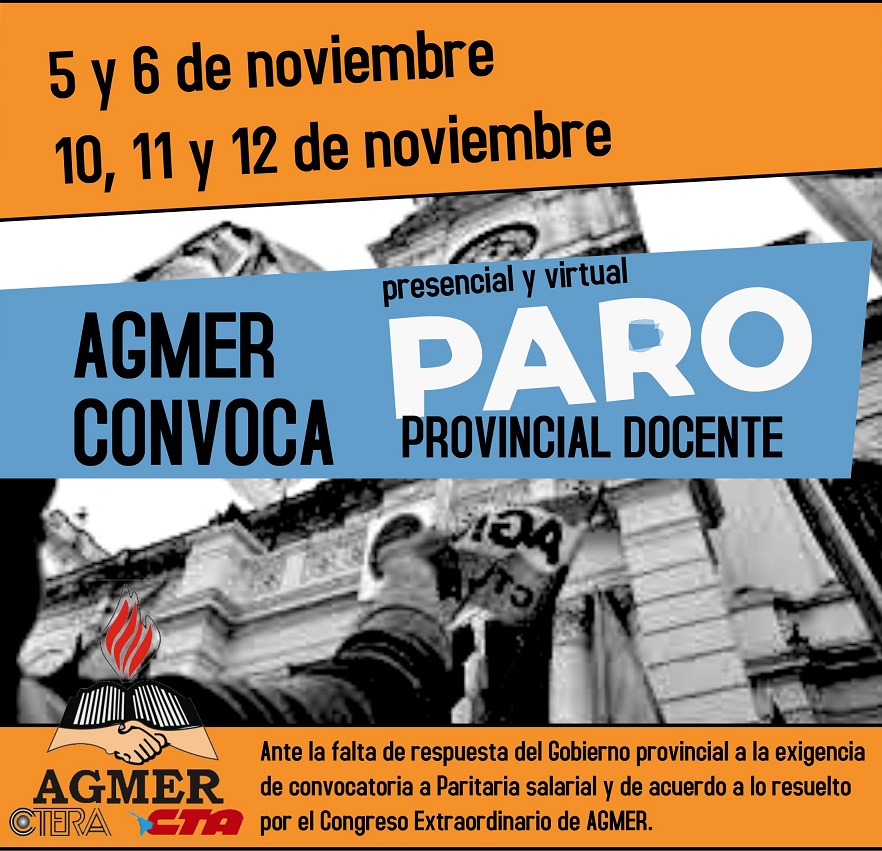 Paraná. Ante la falta de respuestas del Gobierno a la demanda de convocatoria a paritaria salarial, se harán efectivos los paros aprobados por Congreso: 5 y 6 de noviembre – 10, 11 y 12 de noviembre.
