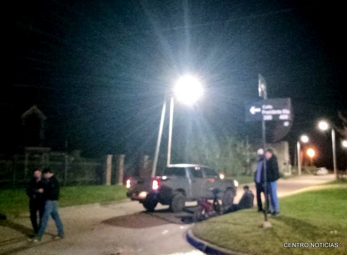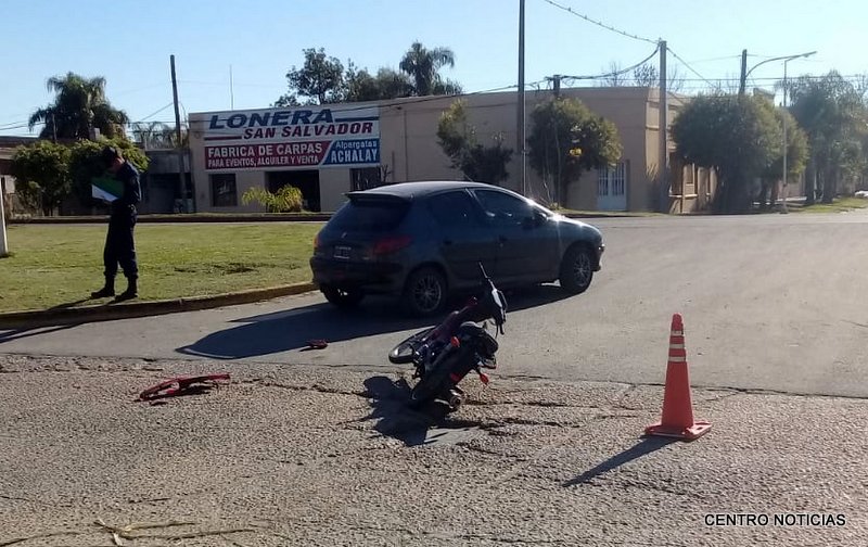 San Salvador. Alrededor de las 19hs de este jueves 28 de mayo, en intersección de calles Illia y Urquiza, se produjo un accidente de transito protagonizado por una camioneta marca Toyota Hilux de color gris y una motocicleta marca Corben 110 cm3 color roja; por causas que se tratan de establecer la motocicleta impacta en el lateral derecho puerta trasera y el masculino que se conducía en la moto cayó a la cinta asfáltica donde se golpea en una de sus rodillas.